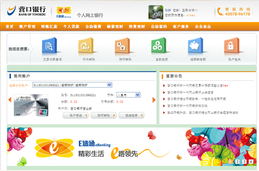 營口銀行個人網(wǎng)上銀行大眾版提供賬戶管理、我的賬戶互轉、貸款信息查詢、儲蓄理財和客戶服務等功能。您可以選擇相應的菜單后點擊需要操作的子菜單進行操作。