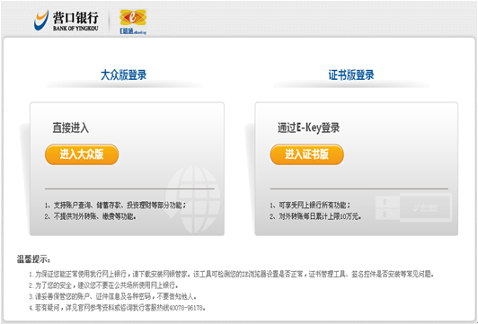 營口銀行個人網(wǎng)上銀行專業(yè)版提供賬戶管理、轉(zhuǎn)賬匯款、自助繳費(fèi)、儲蓄理財、投資理財、自助簽約、客戶服務(wù)等功能。您可以選擇相應(yīng)的菜單后點(diǎn)擊需要操作的子菜單進(jìn)行操作。 |